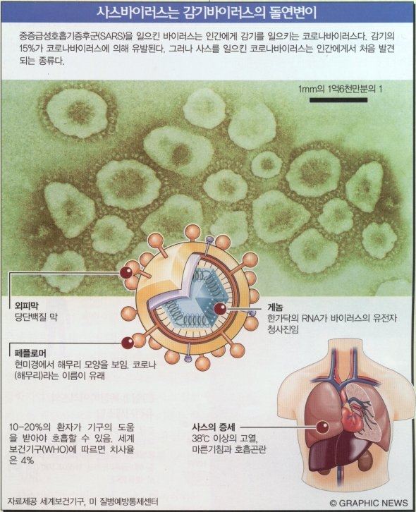 공포의 호흡기 전염병(SARS)이 5월10일 현재 감염자7206명, 사망자526을 기록하며 전세계를 공황 상태로 몰아가고 있다.