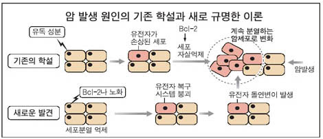 늙을수록 암에 잘 걸리는 것도 이처럼 세포 자살 프로그램에 고장이 난 것으로 기존 학설은 풀이했다.