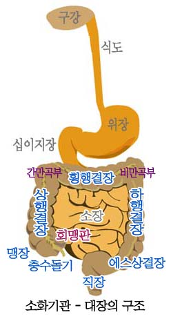 소장에서 여러 영양소와 수분이 상당량 흡수된 후 남은 내용물은 소장의 말단 부위인 회장에서 회맹판을 지나 맹장으로 들어온 후 대장의 나머지 부분을 지나게 됩니다.
