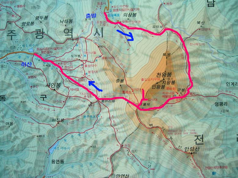 두어 시간이면 내려 올 지름길을 장불재에서 만난 나이 지긋한 등산객에게 물어 온 산행길이