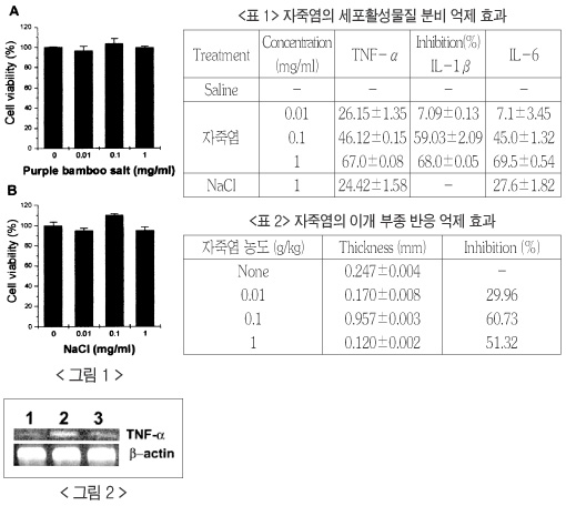 자죽염에 의한 PMA와 A23187 유도성 TNF-α, IL-1β, IL-6 분비 억제 효과를 ELISA 방법으로 분석한 결과, 자죽염은 자극된 HMC-1 세포로부터 TNF-α의 분비를 67.0±0.08%, IL-1β의 분비를 68.0±0.05%, IL-6의 분비를 각각 69.5±0.54% 억제했으며, NaCl(1mg/ml)도 TNF-α와 IL-6의 분비를 억제했으나 자죽염보다는 효과가 현저히 낮았다<표 1>.
