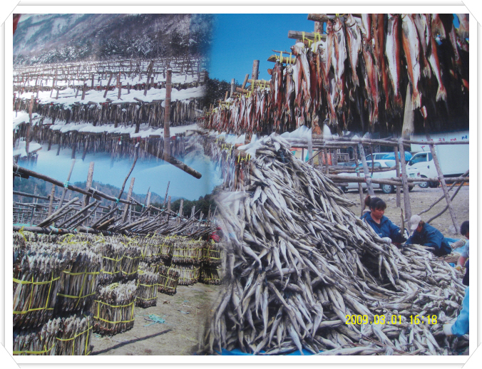 특히 마른 명태는 겨울 햇볕에 차갑게 말리므로 낮에는 풀어져 마르고(解乾) 밤에는 얼어 굳어지는(凍硬) 과정에서 간유분(肝油粉)이 합성, 함유된 수기(水氣)와 화기(火氣)가 수정(水精)과 화신(火神)으로 변화하여 영묘한 약성을 갖게 된다.