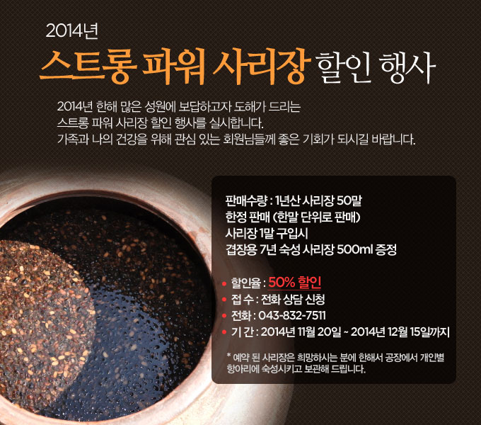 사리장(일명:서목태 죽염 藥간장 육(肉)장인 유황오리와 두(豆)장인 서목태가 만나 새로운 물질로 탄생)