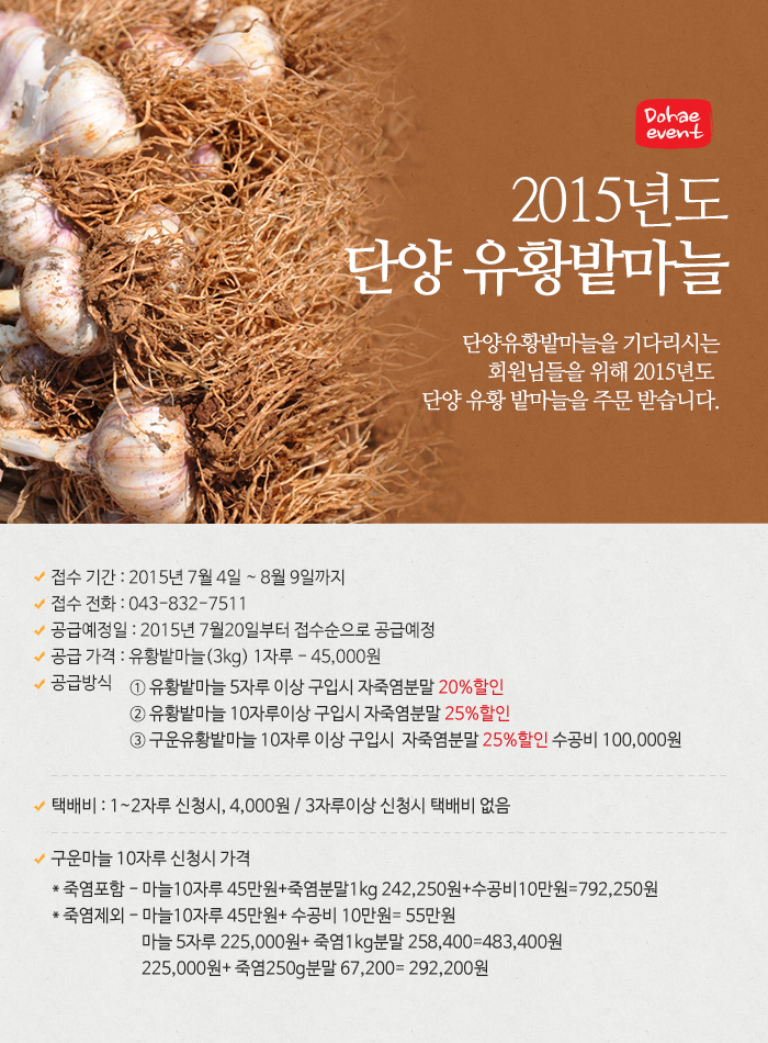 위와 같이 2015년도 단양 유황밭마늘 이벤트를 준비했사오니 많은 참여 바랍니다.
