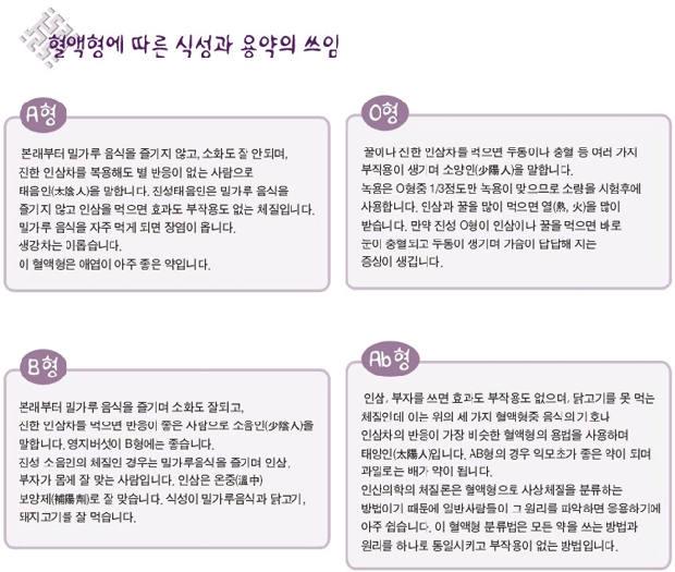 만약 여기에서 O형의 피의 성질이 90%를 넘어 진성에 가깝게 되면 그 사람은 인삼이나 꿀을 먹으면 눈이 충혈 되고 머리가 심하게 아픈 부작용을 호소하지만 O형이라도 이런 증상을 호소하지 않는 사람은 다른 혈액형의 성질을 많이 지녔다고 보면 됩니다.