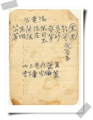 인산 할아버님 친필 처방☞ 소황탕(消黃湯)과대(참외꼭지), 흑반, 인진, 제피, 서목태, 맥아, 영사, 건금, 各 등분(같은 양으로)
