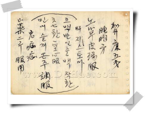仁山 할아버님 친필 처방. ☞ 肝 디스토마 ※ 고백반 인중백작환 을 빚어 하루 6.7회 빈속에 복용. 또 민어 쓸개를 따뜻한 술에 타 복용.