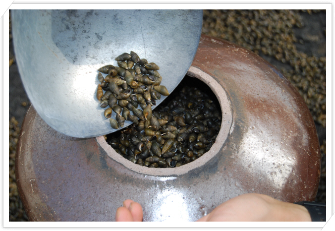 2013년 민물고동( 다슬기기름. 小田螺油 )작업
