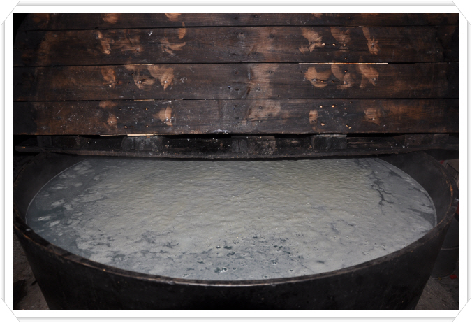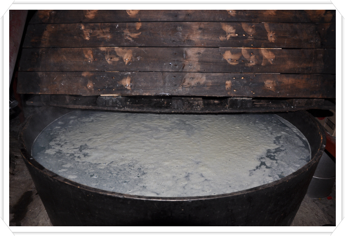 부족한 물은 중간에 백비탕(白沸湯)을 계속 끓여서 물을 보충하여 다린 물에 유황 밭 마늘, 홍화씨, 유근피 외 그 밖의 식자재를 손질 및 깨끗이 세척 한 후 가마솥에 넣고 다린 후 찹쌀과 엿기름을 두고 삭혀서 다음날 걸려 6시간을 졸여서 엿을 만들고