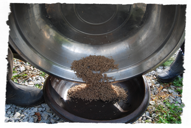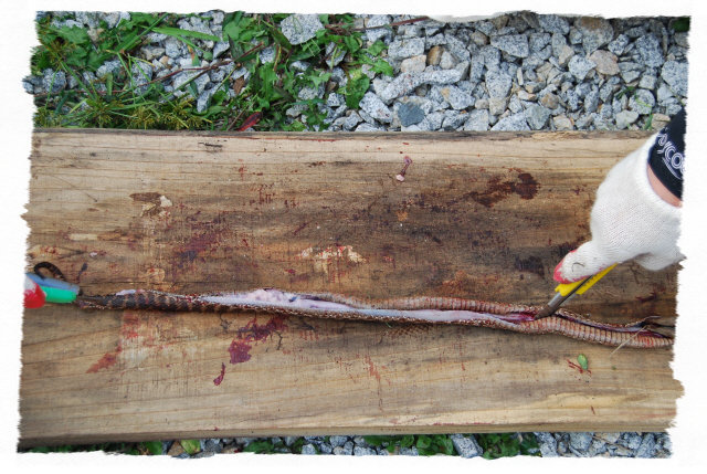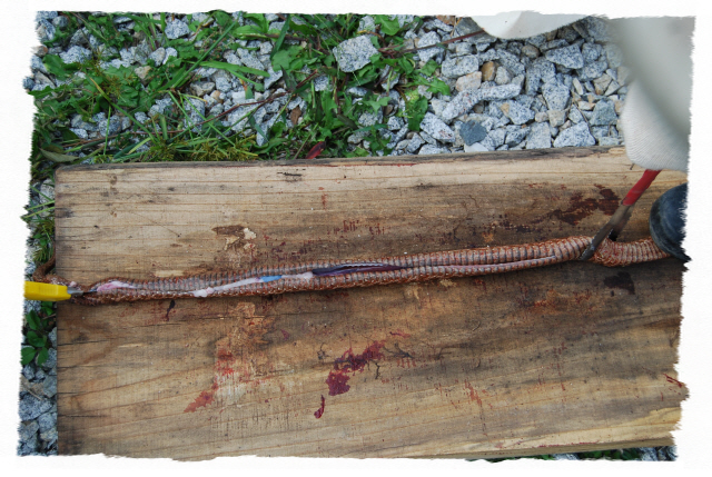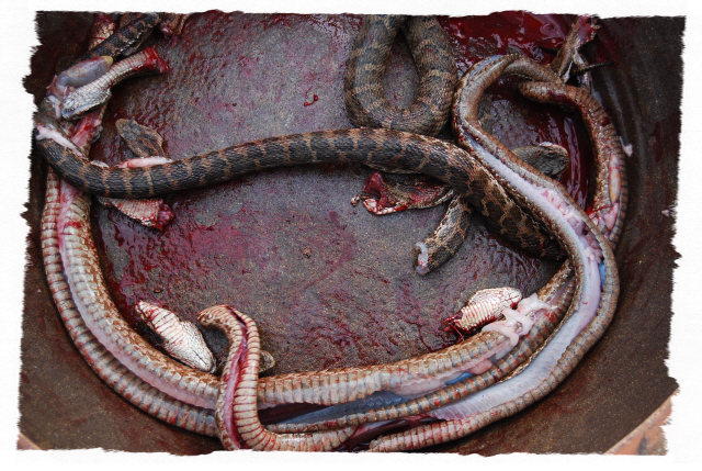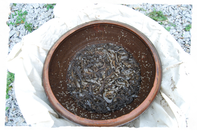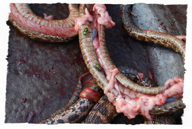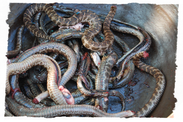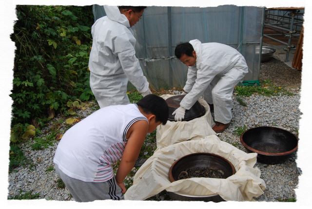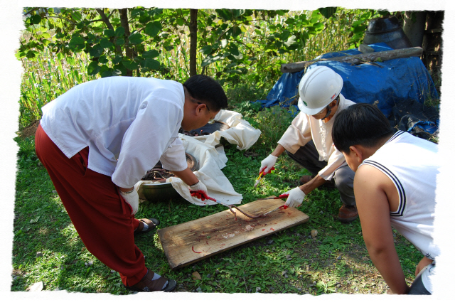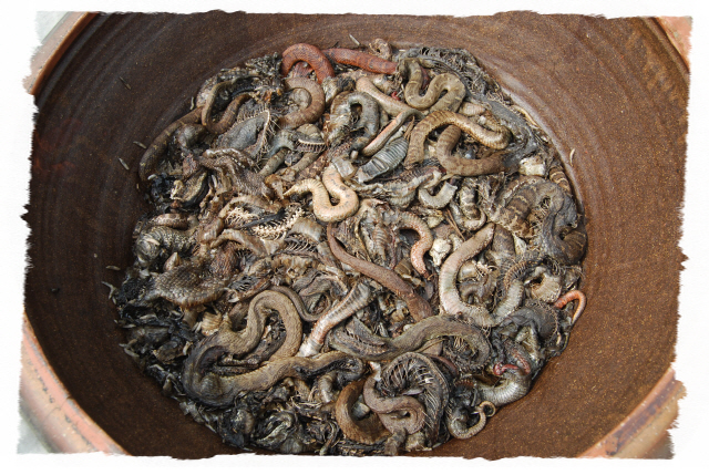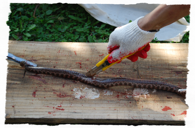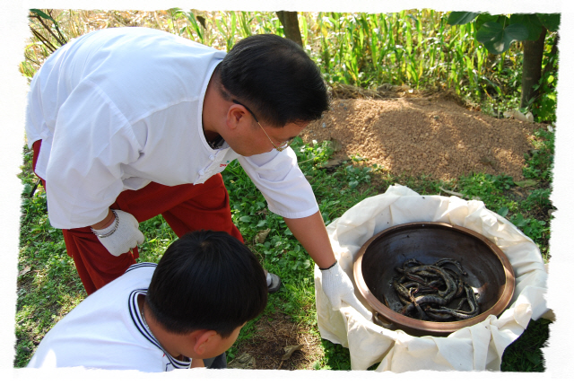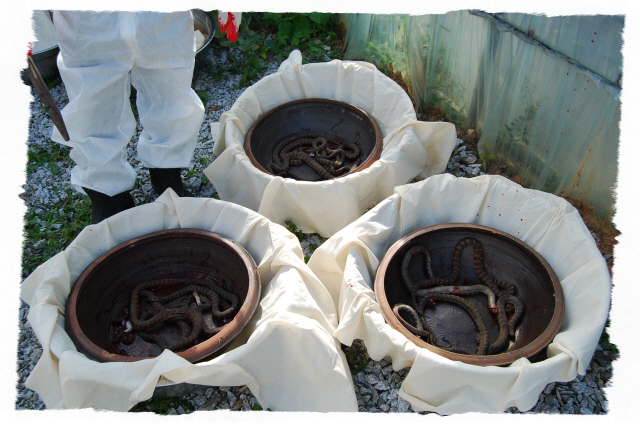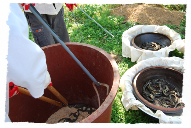 그리고 입추가 지난 뒤 독사(살모사) 100 마리와 길이 1.8m 이상 되는 구렁이 3마리에 칠점사 20마리에 구더기를 내어 다 먹이도록 한다.