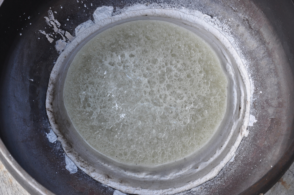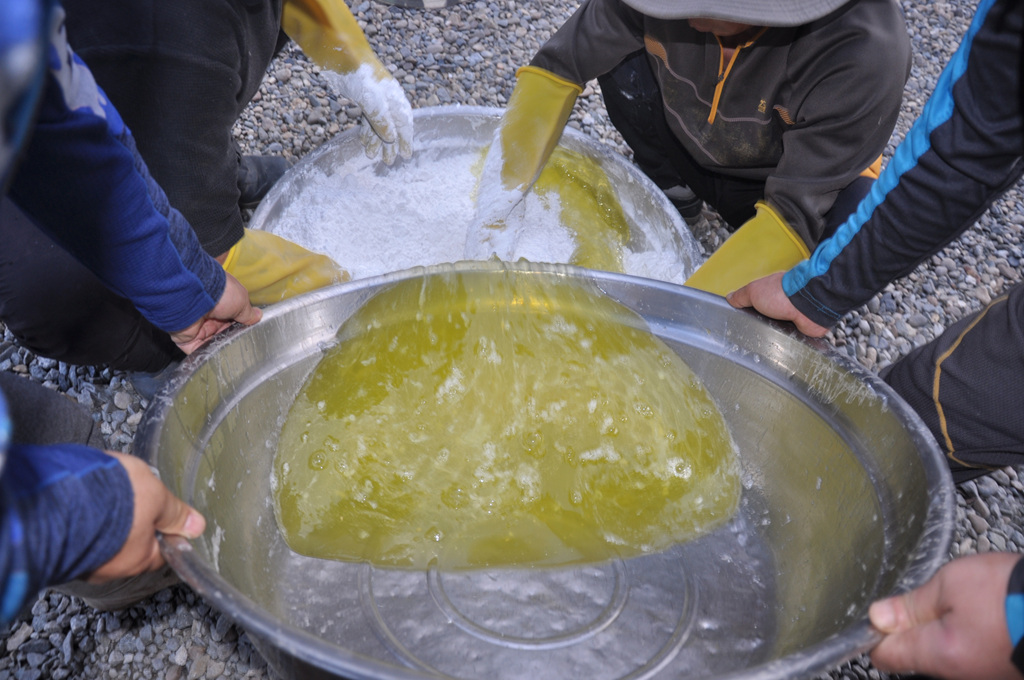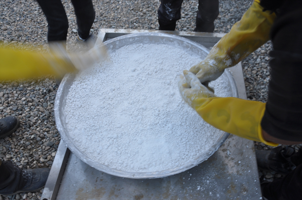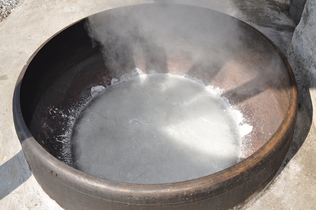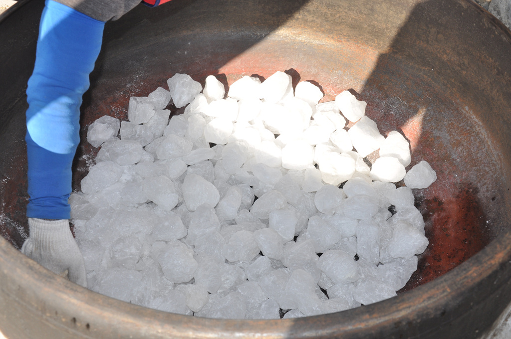 소나무 장작불로 24시간 천연(天然) 백반(白礬)을 구우면 백반이 용융(鎔融)되면서 수기(水氣)는 날라 가고 화극금(火克金)의 원리로 소나무불의 화(火)와 공간의 색소(色素)가 백반에 있는 백금(白金) 속으로 들어가며 백반법제(法製)가 완성된 후 백반을 분쇄 분말하여 토종(土鐘)계란이나 오골계란 흰자위와 혼합하면