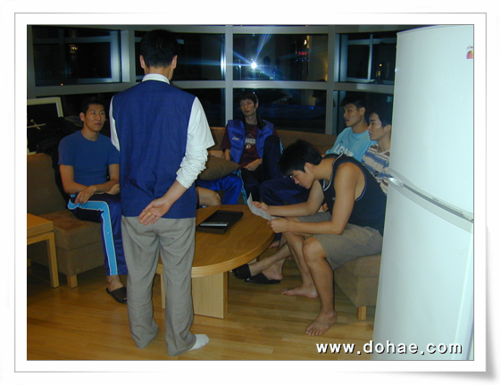 약재에 관해 설명중이신 사무장님... 이번에 선수들이 먹는 "장근탕"은 장수들이 먹는 인산의학만의 비방으로 근골을 강화시켜주고 지구력및 체력을 증가시키며, 신경통, 관절염, 중풍을 다스리고 하체를 강화 시켜줄 뿐 아니라 소염, 살균의 기능을 가지고 있습니다. 도해안약을 넣어보고 있는 선수들... 도해 안약의 효능에 놀라하시는 코치님 ^^*