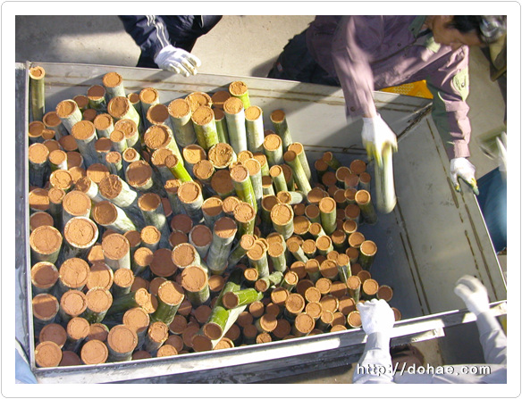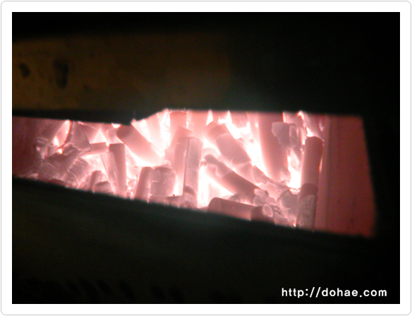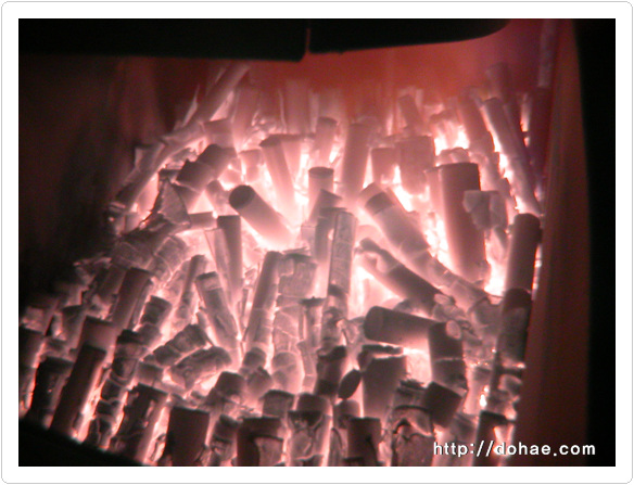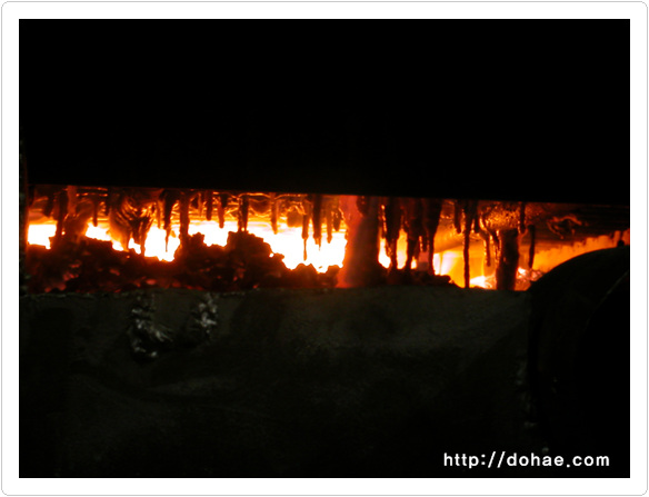 대나무를 잘라서 천일염을 단단하게 다져 넣고 황토를 이쁘게 발라서 로에 차곡착곡 쌓은 모습입니다. 소금이 녹아서 마치 종유석 처럼 되었습니다. 말이 필요가 없습니다. 열기가 느껴지세요? 사진 찍다가 카메라 녹아 내리는 줄 알았습니다. 옆에서 로뚜껑 들어올려주신분(?) 감사합니다.^^ 지금 이시간에도 소금기둥이 벌겋게 달아올라 색소를 합성(五神合成)하고 있습니다. 도해죽염 3회 작업중 몇 장 올려봅니다.