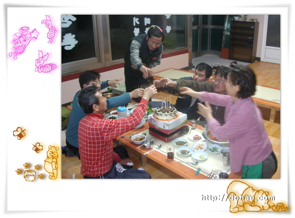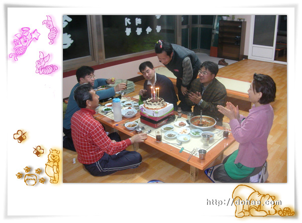 신선촌에서~ 생신축하 드립니다. 축하 축하 축하~~~ 머리에 꽃을 달으셨네요. 유현재님 침흘리시는 모습좀 봐~~~ 메롱^^ 생신축하드립니다. 가족과 함께 보내셔야 되는데 ... 사모님께 감사드립니다. 그리고 성행아 성지야 내년에는 아빠 보내줄께~ 듣고 계신노래는 정부장님의 애창곡 "흙에 살리라~~~"