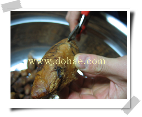 그걸 테[터지게 해] 놓으면 무서운 냄새 나요. 터질때 폭파하는 소리도 요란하고. 그래서 그 놈을 생강을 두껍게 깔고 그 위에다 푹 찌는 걸 두 번 쪄 가지고 까서 먹어 보니까 오히려 생 것을 찐 것보다 맛있어.