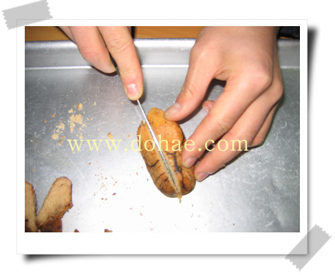 그걸 테[터지게 해] 놓으면 무서운 냄새 나요. 터질때 폭파하는 소리도 요란하고. 그래서 그 놈을 생강을 두껍게 깔고 그 위에다 푹 찌는 걸 두 번 쪄 가지고 까서 먹어 보니까 오히려 생 것을 찐 것보다 맛있어.