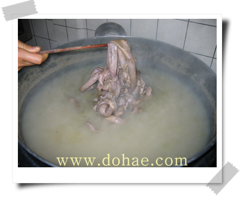 열심히 손질한 돼지 창자를 국으로 끓이고 있습니다.