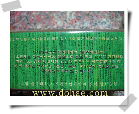 또한 여성 갱년기 장애 개선에 탁월한 효능이 있으며, 혈액중의 노폐물(rubbish)을 제거하여 혈액을 정화하고 혈압을 낮춰주는 기능을 촉진한다고 기록되어 있습니다.