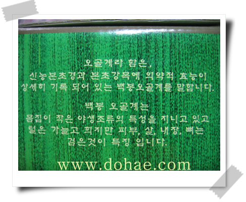 즉, 오골계 라 함은 깃털은 견사와 같이 희고 가늘며 피부, 살, 뼈는 검정색인 백봉오골계를 지칭하는 것입니다.