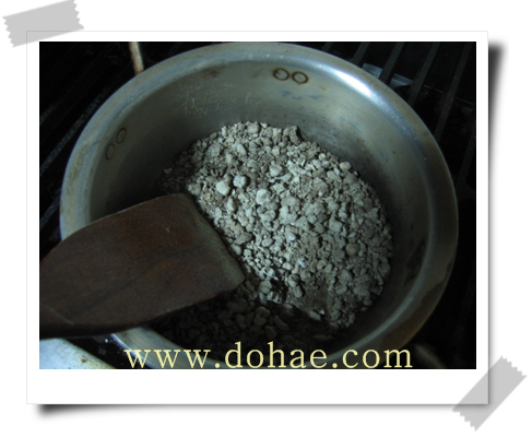 보리차를 많이, 보리 한 되쯤 넣고 오래 끓여 가지고 그 물을 한 투가리 담아 놓고서 거기다가 계분백 분말한 거, 엿기름하고 누룩하고 볶은 가루지.