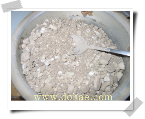 그 달구똥[닭똥] 흰 부분 그걸 계분백이라고 해요. 또 신곡(神曲), 맥아(麥芽), 누룩과 엿기름 그걸 곱게 빻아 가지고 모두 삼배 보자기에 싸 가지고 그 투가리의 보리차에다 담아 두면 24시간 후에 가만히 건져서 물을 따르면 그 물에 모두 우러나요.