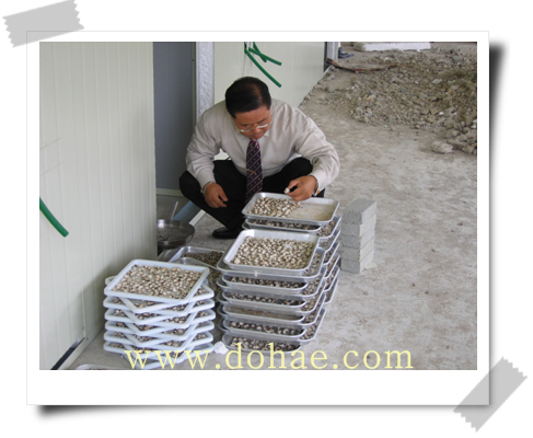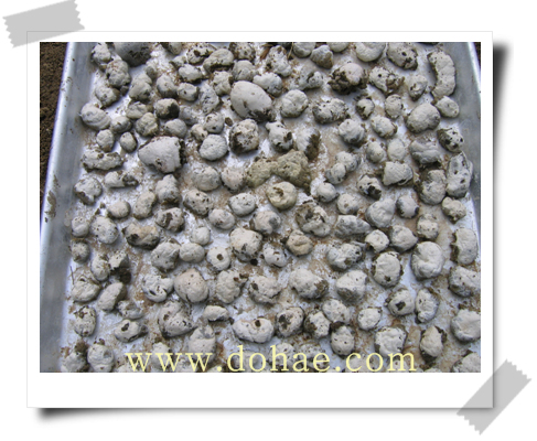 계분백탕이란? 오골계똥의 하얀부분과 \"신곡\"과 \"맥아\"를 법제하여 보리차물에 우려서 만든 물을 말한다. 말리는 중. 왼쪽 류인덕/공학박사 충주대 교수, 오른쪽 도해 주경섭/동방대학원 대학 자연치유학과 교수,