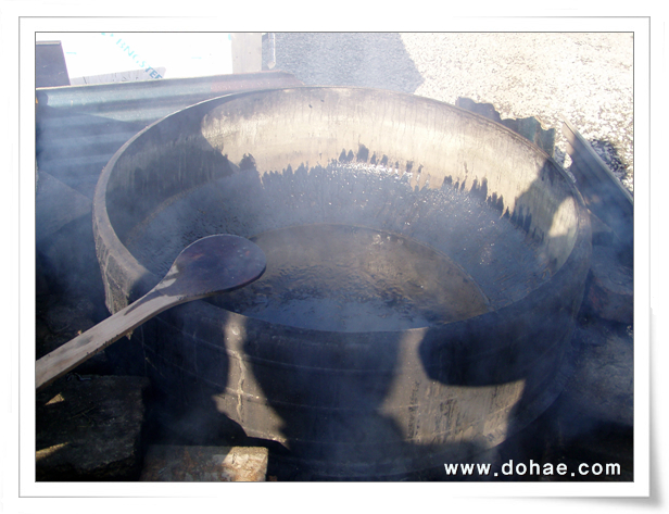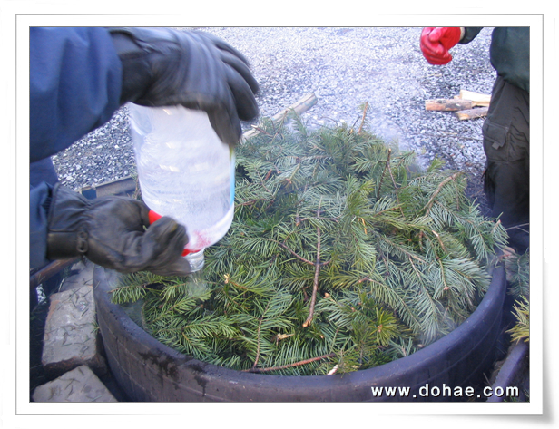 30리터가 넘게 들어가는 가마솥에 채취한 전나무 잎을 가득 담고 여기에 소주 20리터를 붓고 센 불로 1시간, 중간 불로 1시간, 약한 불로 10시간쯤 끓이면 솥 안의 소주가 4~6리터쯤으로 줄어든다. 4~6리터쯤으로 줄어든 소주를 미세한 체로 걸러내어 찌꺼기는 버리고 오지그릇에 담아 약한 불로 고가 될 때까지 졸인다.