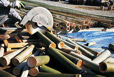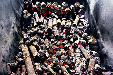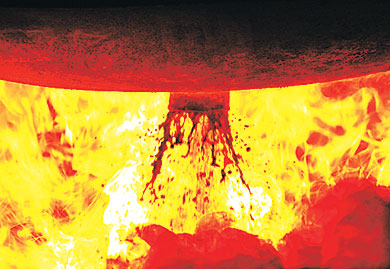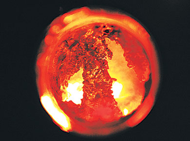 | ▲불꽃 정성 죽염을 만들기 위해선 대통 속의 천일염을 소나무 장작으로 섭씨 800도 이상에서 여덟 번 구운 뒤, 송진을 연료로 해 마지막으로 2400도의 고온에서 한번 더 구우면 된다. 마지막 아홉 번째를 굽는 노에서 화려한 불꽃이 일어나고 있다. 긴 불꽃은 조리개를 10초 동안 개방해 촬영했다. |