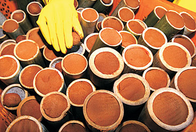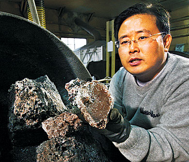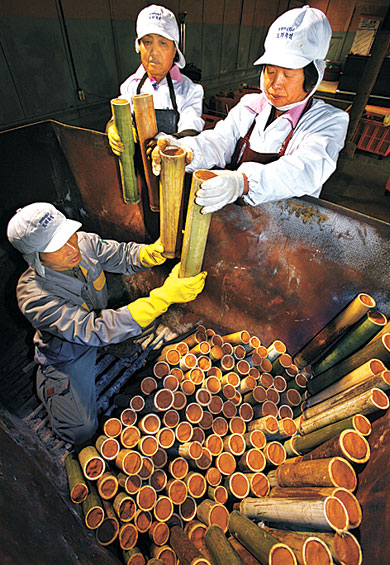 다름 아닌 자죽염이다. 대나무 통 속에 천일염을 넣고 쇠로 만든 노(爐)에서 아홉 번째 구워져 나온 자죽염은 실제 자수정을 보는 듯 영롱한 빛을 띠고 있었다. 인산 선생이 말한 바로 그 ‘신약’이다. 조선 세종 때 간행된 ‘향약집성방’에서는 “소금은 맛이 짜고 따뜻하며 독이 없다. 흉 중의 담(가래)을 토하게 하고 급작스러운 복통을 그치게 하며 기골을 견고하게 한다. 눈을 밝게 하며 오장육부를 조화하고 묵은 음식을 소화시켜 사람을 강건하게 한다”고 했다. 이러한 소금을 대나무 통 속에 넣어 아홉 번 불에 구운 것이 죽염이다. 죽염은 민간의학의 하나로 옛날부터 전해져 내려 왔는데, 의학자이자 독립운동가인 인산 김일훈(1909~1992) 선생이 굽는 방법을 체계화하고 약효의 원리를 밝혀 처음으로 죽염이라는 이름을 붙였다고 한다. 환경오염이 날로 심각해지고 있는 가운데 죽염은 웰빙 바람을 타고 건강애호가들로부터 한층 많은 사랑을 받고 있다. 죽염은 인체의 여러 질병에 예방 및 치료 효과가 큰 것으로 알려져 있으며, 노화와 발암물질의 활동을 완화시켜 주고 갖가지 공해 독을 풀어주는 힘도 뛰어나다고 한다. 죽염을 만들기 위해서는 우선 지리산 부근에서 3년 이상 자란 왕대나무를 사용하는데, 왕대나무의 마디를 잘라 만든 대나무 통 속에 간수를 뺀 서해안 산 천일염을 다져 넣는다. 그리고 깊은 산속에서 파 온 황토를 반죽해 대통의 입구를 막는다. 소금을 채워 넣은 대통들을 쇠로 만든 가마에 차곡차곡 쌓은 뒤 소나무 장작으로 불을 지펴 굽는다. 약 5시간을 섭씨 800도~1000도로 구우면 대통은 재가 되고 소금은 녹으면서 굳어 하얀 기둥으로 변한다. 이 소금 기둥을 가루로 만들어 다시 새 대통 속에 다져 넣고 처음과 같은 방법으로 굽기를 반복한다. 이렇게 여덟 번을 반복해서 구우면 소금은 흰색에서 점점 잿빛으로 색이 짙어진다. 마지막 아홉 번째 구울 때는 특수하게 고안된 노에서 송진으로 불을 때 2400도의 고온으로 급속히 가열해 용융처리한다. 이때 대통 속의 소금은 완전히 녹아 벌겋게 달아오른 노에서 용암처럼 밑으로 흘러내리게 된다. 흘러내린 소금이 굳어 돌덩어리처럼 되는데, 이것을 분말이나 알갱이 형태의 입자로 분쇄한 것이 죽염이다. 대통 속의 소금을 아홉 번째 구울 때 온도를 짧은 시간에 초고온으로 높이면 보라색 자수정 빛을 띤 자죽염이 탄생하게 된다. 인산 선생은 5000도의 고열로 뽑아낸 죽염을 최상의 죽염이라고 했다. 인산 선생의 수제자인 주경섭(38·동방대학원대학교 자연치유학과) 교수는 각고의 노력 끝에 자죽염을 만들어 냈다. 7년 동안 인산 선생으로부터 인산학을 배운 주 교수는 스승이 생전에 방법을 알고 있었으나 만들지 못했던 자죽염을 아홉 번째 굽는 과정에서 노의 온도를 2000도 이상으로 올릴 수 있는 방법을 고안해 내 자죽염을 만드는 데 성공했다. 아홉 번째 소금을 구울 때 송진을 뿌리는 폭발식을 도입한 것이다. 주 교수는 “질병의 예방과 치료에 있어 가장 중요한 것은 환원력입니다. 산화력이 크면 건강에 해롭다는 것이고 환원력이 크다는 것은 인체에 이롭다는 뜻입니다. 자죽염은 최고의 환원력을 가진 식품입니다”고 말했다. 서울의 태릉 근처에서 도해 한의원을 운영하고 있는 주 교수는 ‘의술을 독점하지 말라’는 스승의 정신을 받들기 위해 ‘도해(www.dohae.com)’에 들어가 회원 가입만 하면 누구나 쉽게 신약지식과 한의학정보 등을 접할 수 있게끔 웹 사이트를 만들어 놓았다. 자죽염 탄생 이렇게 ▲ 지리산 부근에서 자란 왕대나무를 잘라 죽염을 구울 대나무통을 만든다. ▲ 준비된 대나무 통에 천일염을 다져 넣는다. ▲ 걸쭉하게 반죽된 황토로 천일염이 들어 있는 대통 입구를 막는다. ▲ 황토로 입구를 막은 대통을 쇠로 만든 가마에 차곡차곡 쌓는다. ▲ 소금 녹이는 ‘노’ 송진을 연료로 섭씨 2400도의 고온에서 마지막 아홉 번째를 굽는 동안 특수제작된 노가 발갛게 달궈지고 있다. ▲ 한참 구우면 대나무는 타서 재가 되고 소금은 하얀 기둥으로 변한다. ▲ 섭씨 2400도로 가열하면 소금은 순식간에 녹아 마치 용암처럼 흘러내린다. ▲ 용암처럼 흘러 내린 뒤 식으면 덩어리로 변한다. ▲ 아홉 번째 구워서 나온 자죽염 덩어리는 자수정처럼 영롱한 빛을 띤다. ▲ 자죽염의 탄생과정을 설명하는 주경섭 교수. 사진·글 = 박상문기자moonpark@munhwa.com |
