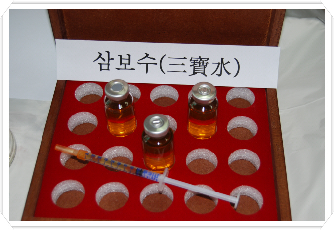 삼보주사(三寶注射)란 유황오리 뇌 3개의 3차 증류수(蒸溜水)인 삼보수(三寶水)에 웅담(熊膽) 사향(麝香)