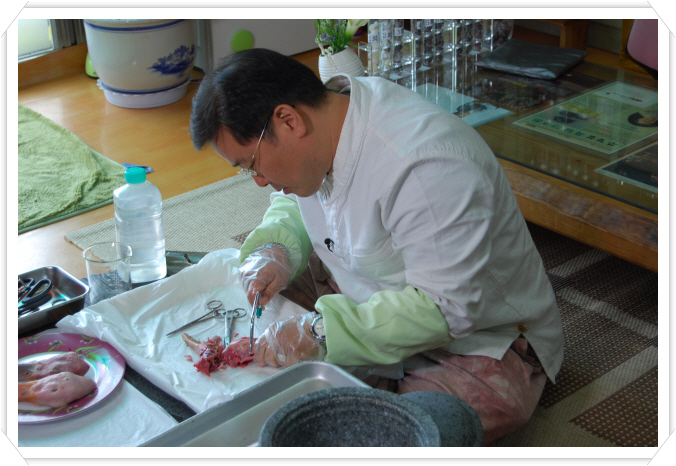 유황오리뇌 3개를 좋은 곱돌솥에 넣고 깨끗한 샘물을 500cc 가량 부은 뒤 3차 증류수(3次蒸溜水)를 만든다.