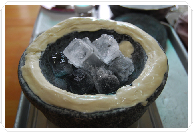 (총 3번) 이때 곱돌솥 뚜껑에 얼음을 놓아 뚜껑이 차게 해준다.
