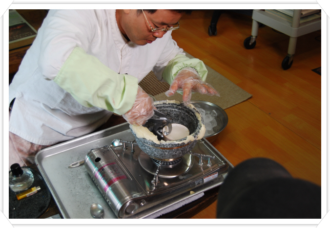 젖혀서 덮어놓은 곱돌솥 뚜껑 언저리에 수증기가 새지 않도록 밀가루 반죽을 발라주는 것이 좋다.