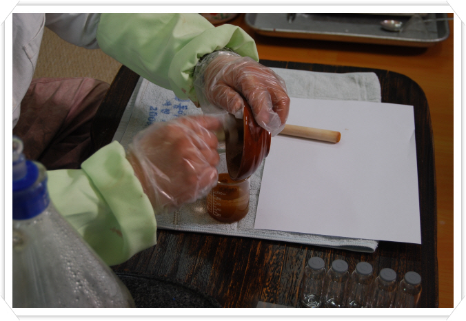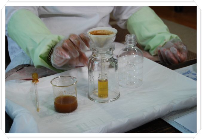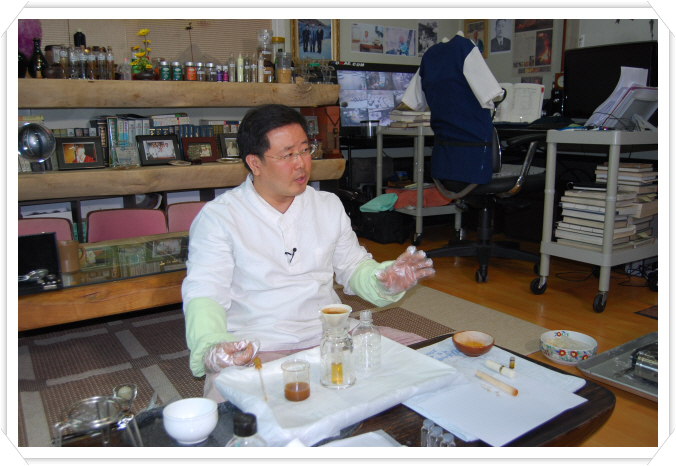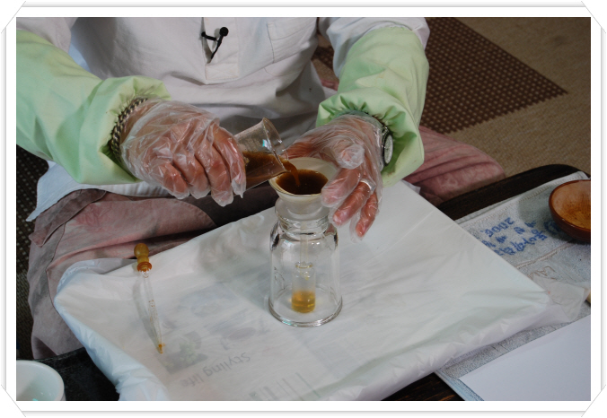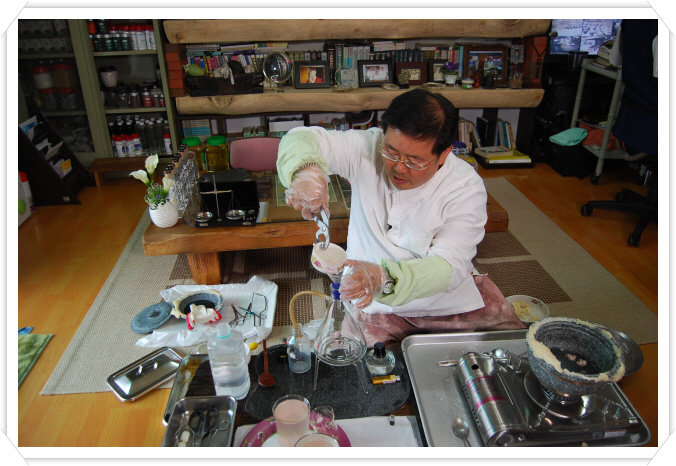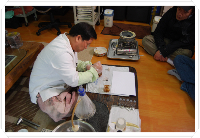 이렇게 물을 끊여 사기그릇에 중류수가 고이면서 곱돌솥안의 물이 마르면 사기그릇의 증류수를 솥안에 붓고서 다시 끊여 증류수를 받는 것을 두 번 더 반복한다.