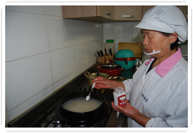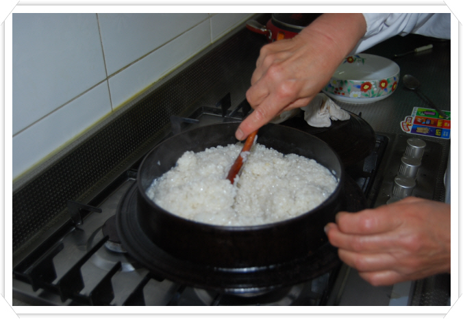 기호(嗜好)에 맞게 넣어서 잘 저은 후에 찰밥을 하는데 밥물이 끓을 때 솥뚜껑을 열고 생들기름을 적당히 기호에 맞게 밥물에 붓고 주걱으로 밥물을 잘 저어 기름이 찹쌀에 골고루 혼합되게 한 후에 솥뚜껑을 덮고 뜸을 잘 들이면 찹쌀밥이 됩니다.