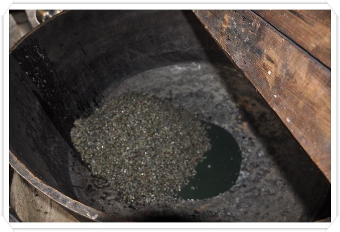 부족한 물은 중간에 백비탕(白沸湯)을 계속 끓여서 물을 보충하여 다린 물에 유황 밭 마늘, 홍화씨, 유근피 외 그 밖의 식자재를 손질 및 깨끗이 세척 한 후 가마솥에 넣고 다린 후 찹쌀과 엿기름을 두고 삭혀서 다음날 걸려 6시간을 졸여서 엿을 만들고